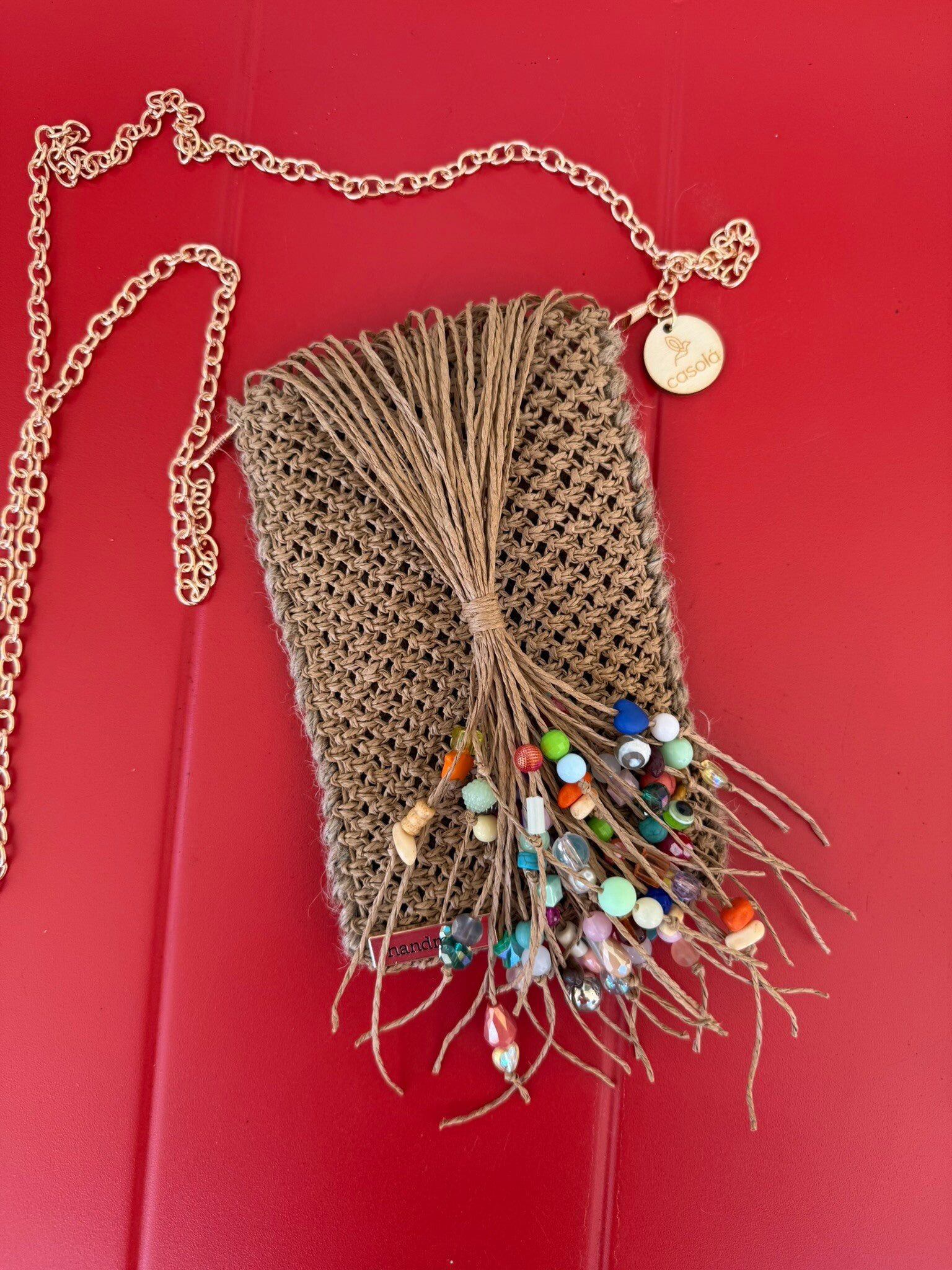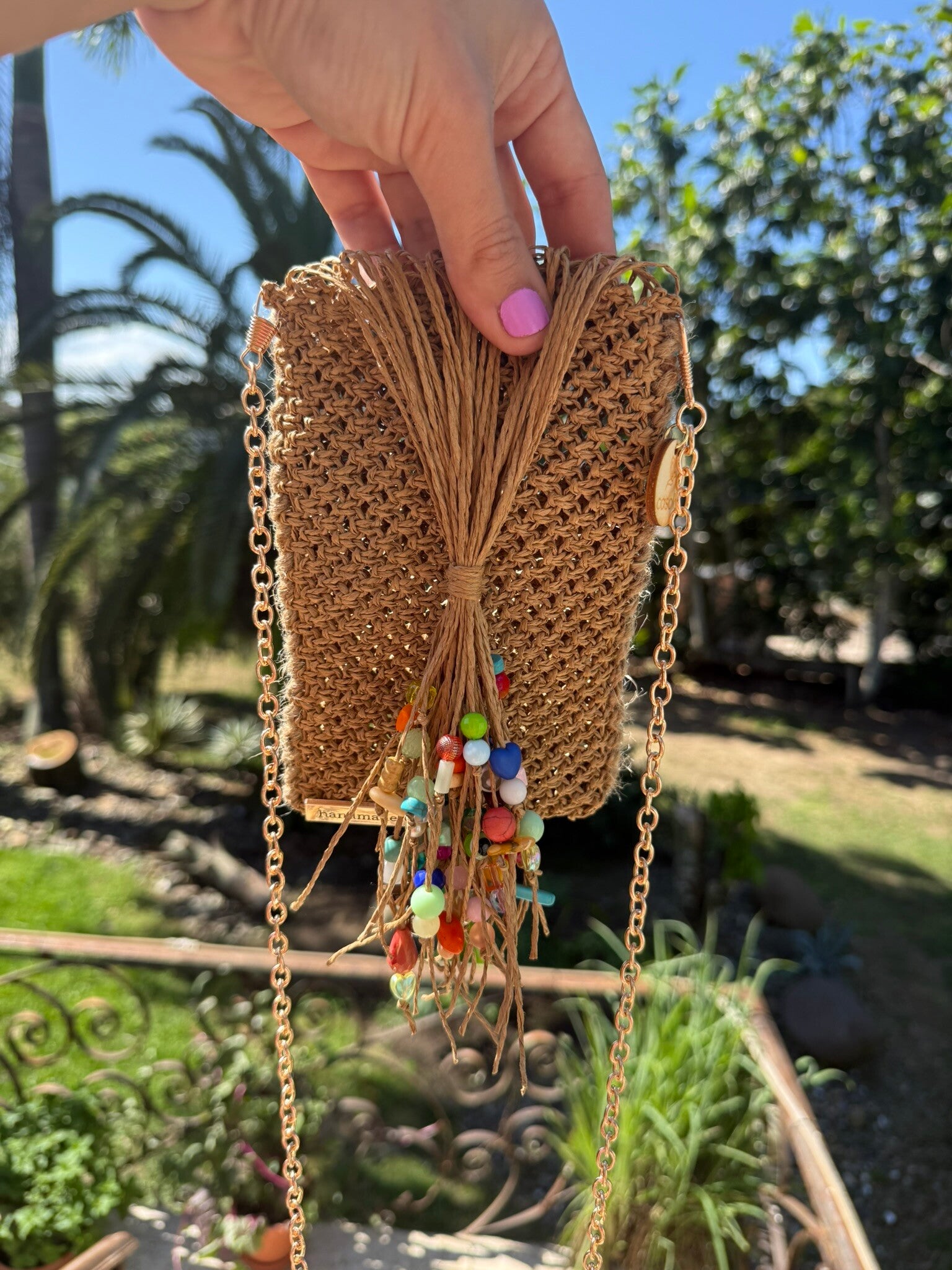 Trabajada cuidadosamente en hilo de Rafia creando asi un estilo rústico, playero, pero exclusivo. Su mango también es creado a mano con bisutería fina y evillas en metal.