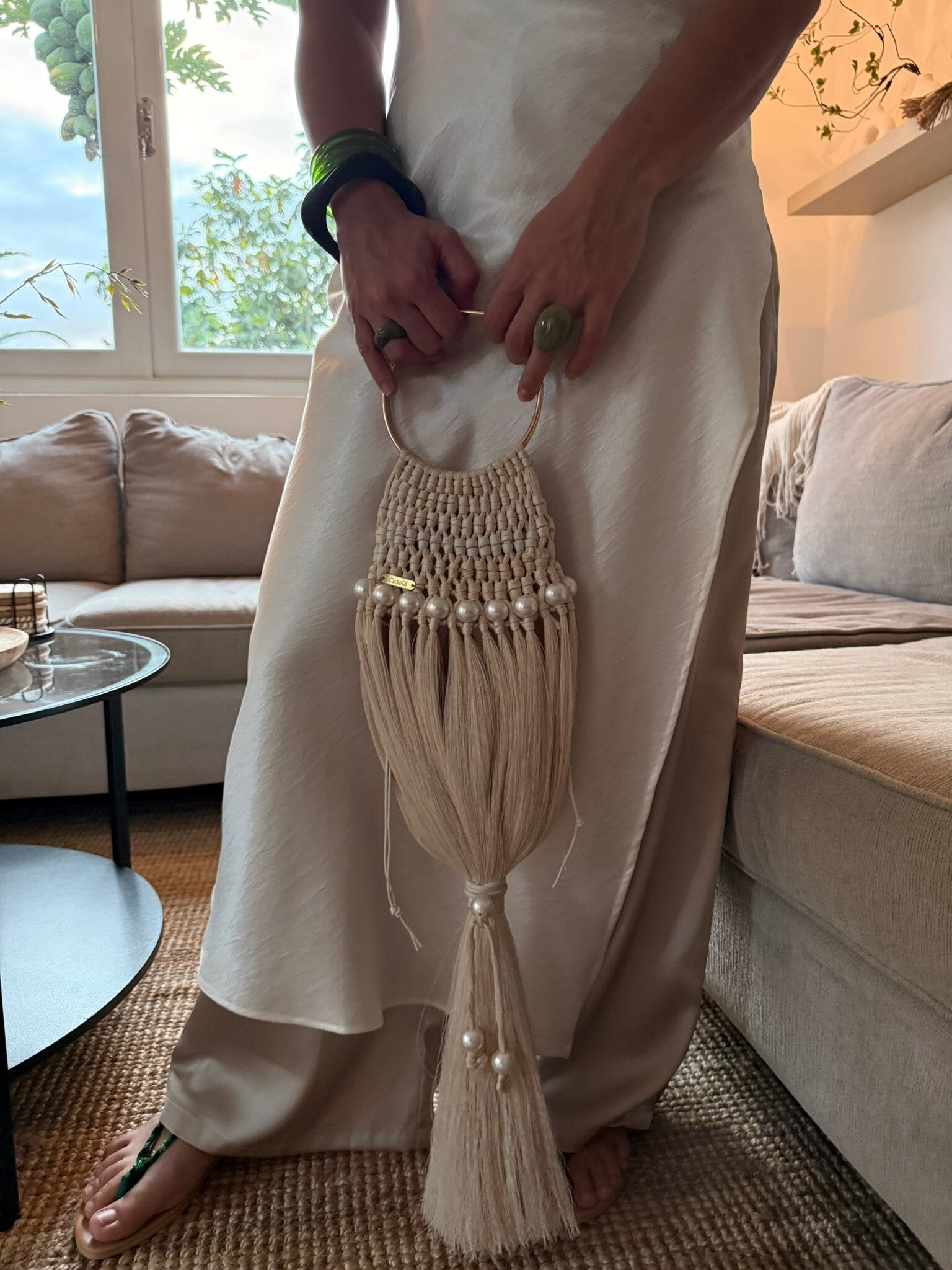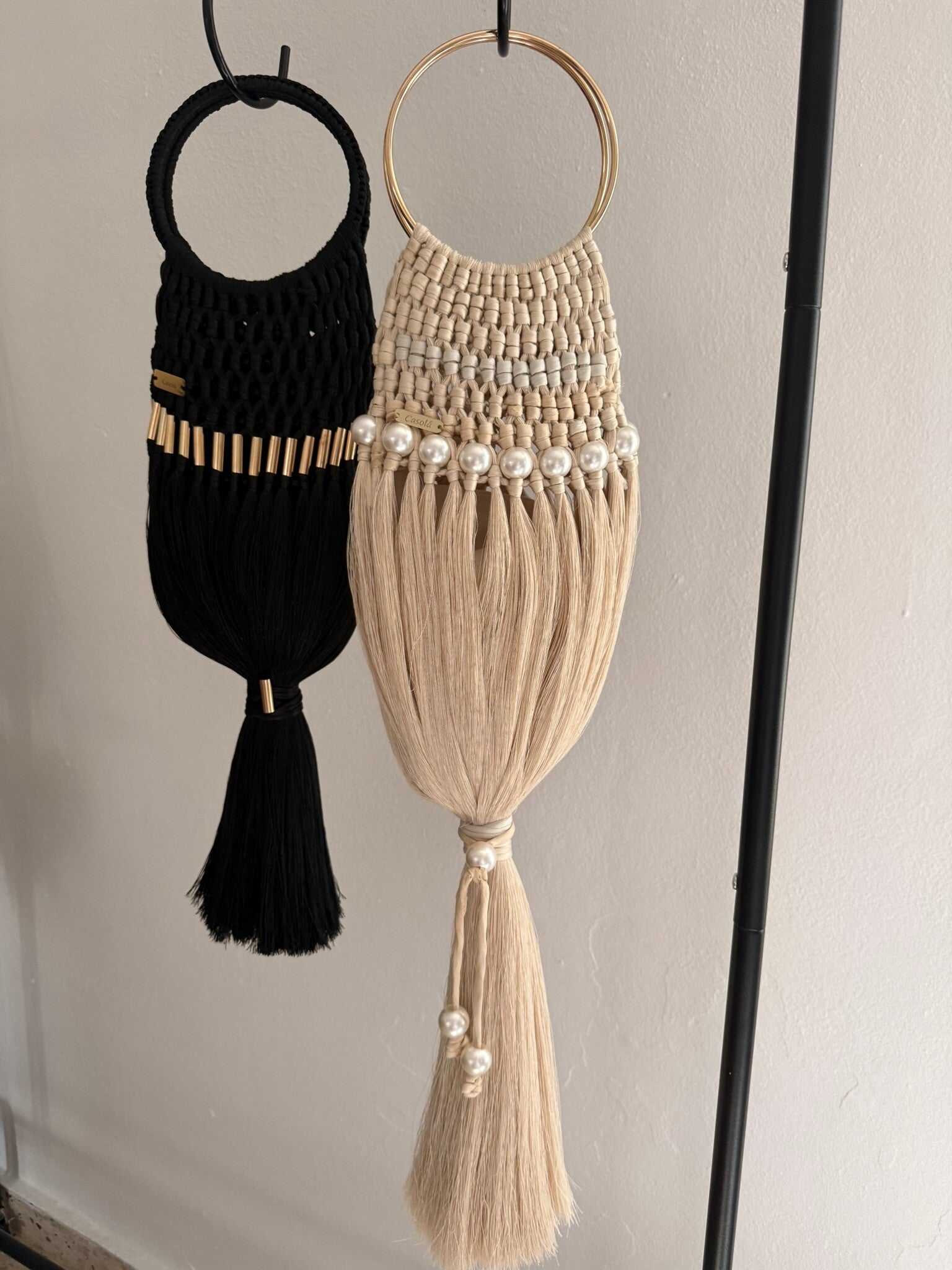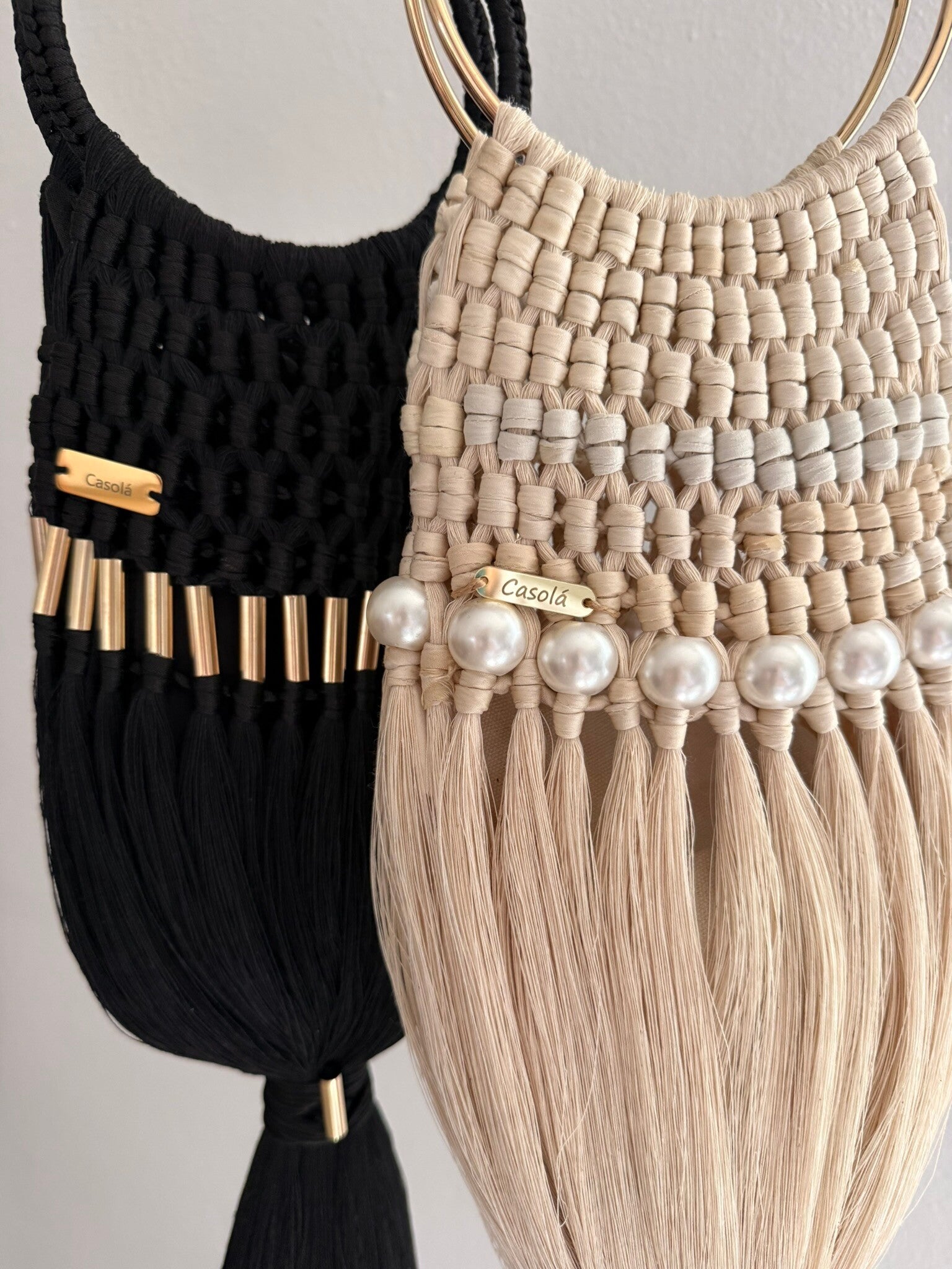 Cartera creada en hilo peinado con asas en metal, bisutería fina y forro para interior en tela satinada. Con de medidas de 10" de profundidad. Creada para resaltar tu elegancia natural y hacerte destacar en cualquier ocasión.